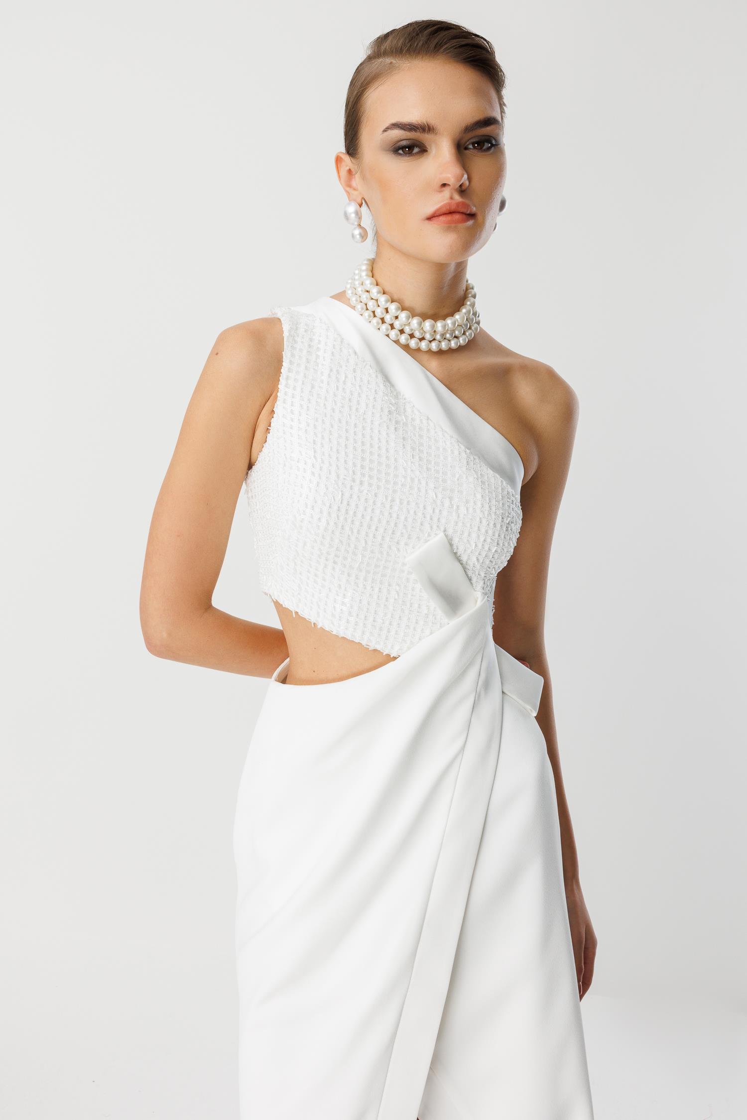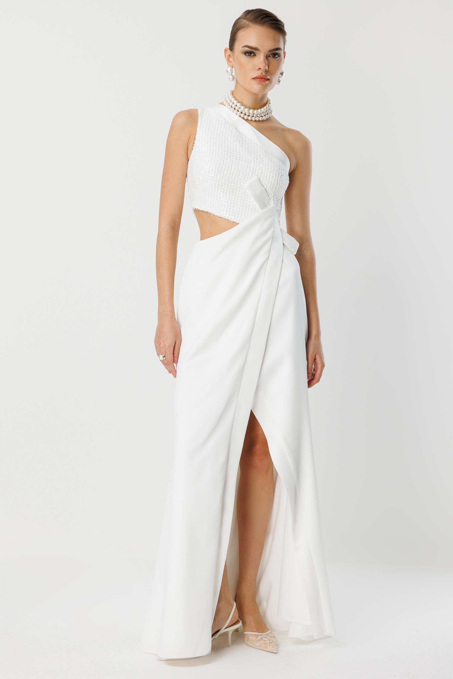 Üst Kısım: Bir omuzdan çapraz inen bölümde, tüm dikkati üzerine çeken, parlak Beyaz Tonlarda Payet (pul) veya boncuk işlemeleri.