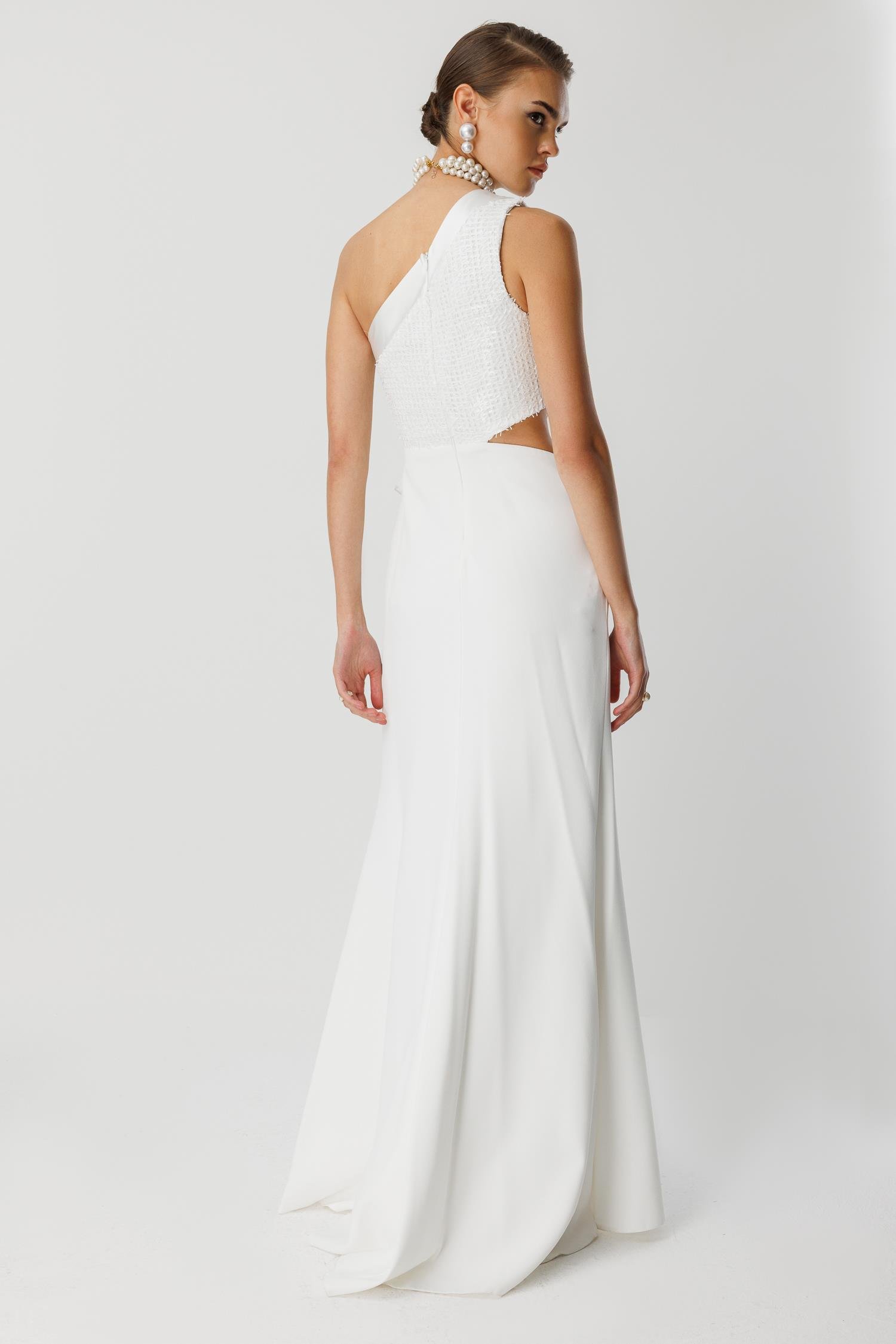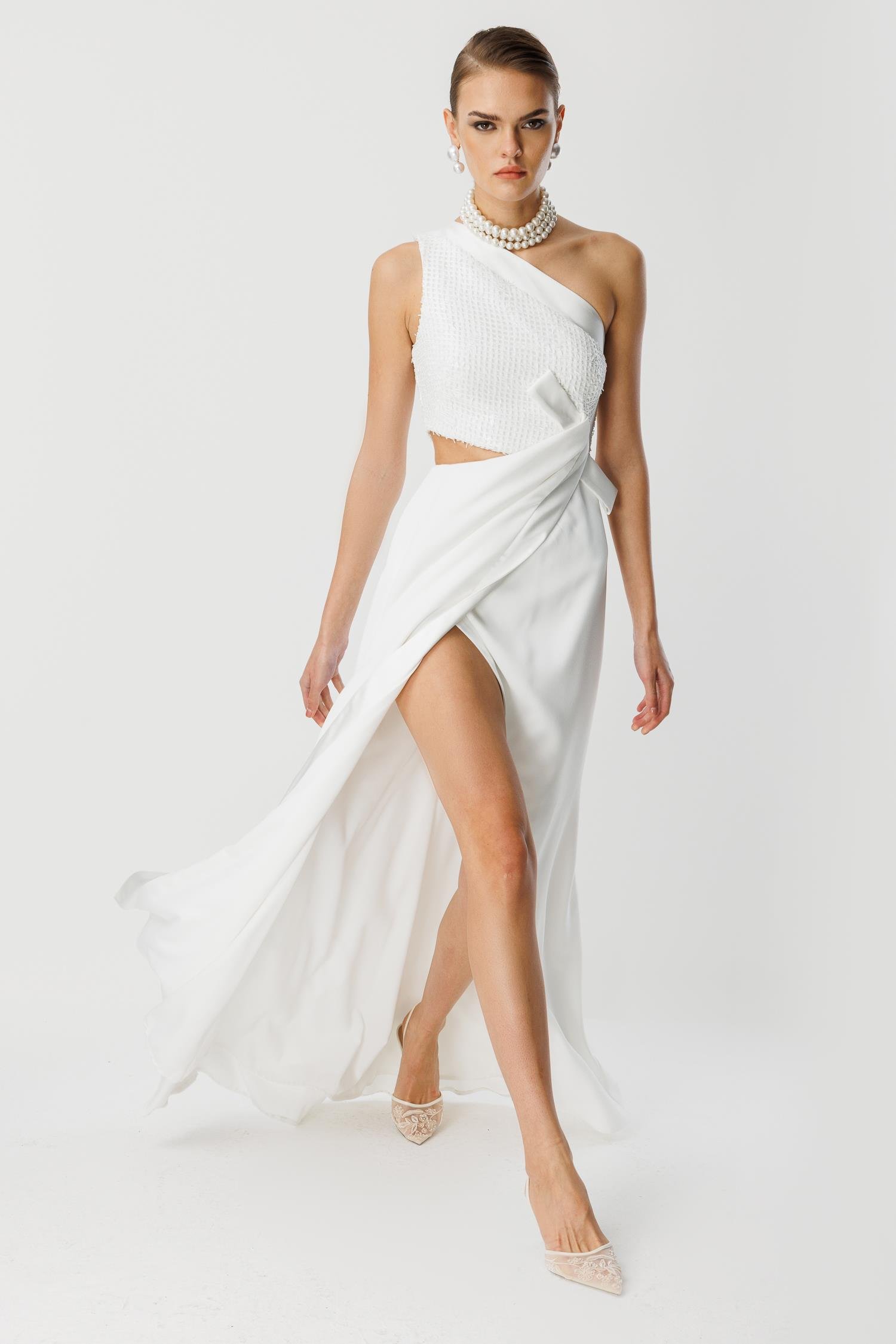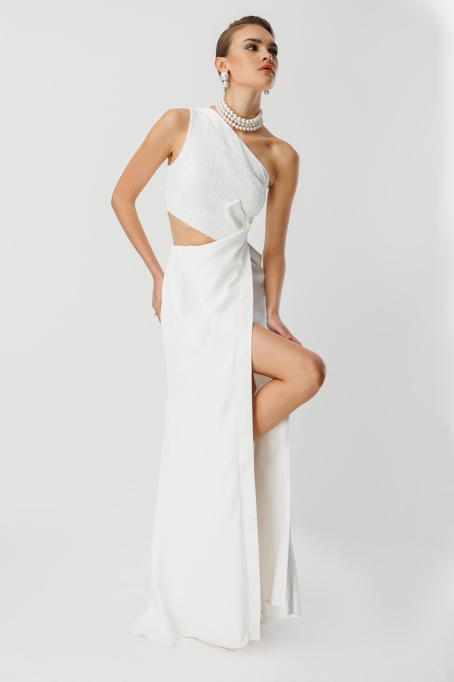 Nikah sonrası davetler, özel yaz galaları, kokteyller ve unutulmaz kutlamalar için tasarlanmış, iddialı ve modern bir model. Beyazın saf ve asil duruşu, göz alıcı payetler ve cesur kesim detaylarıyla birleşerek size benzersiz, zarif ve dikkat çekici bir hava katıyor.