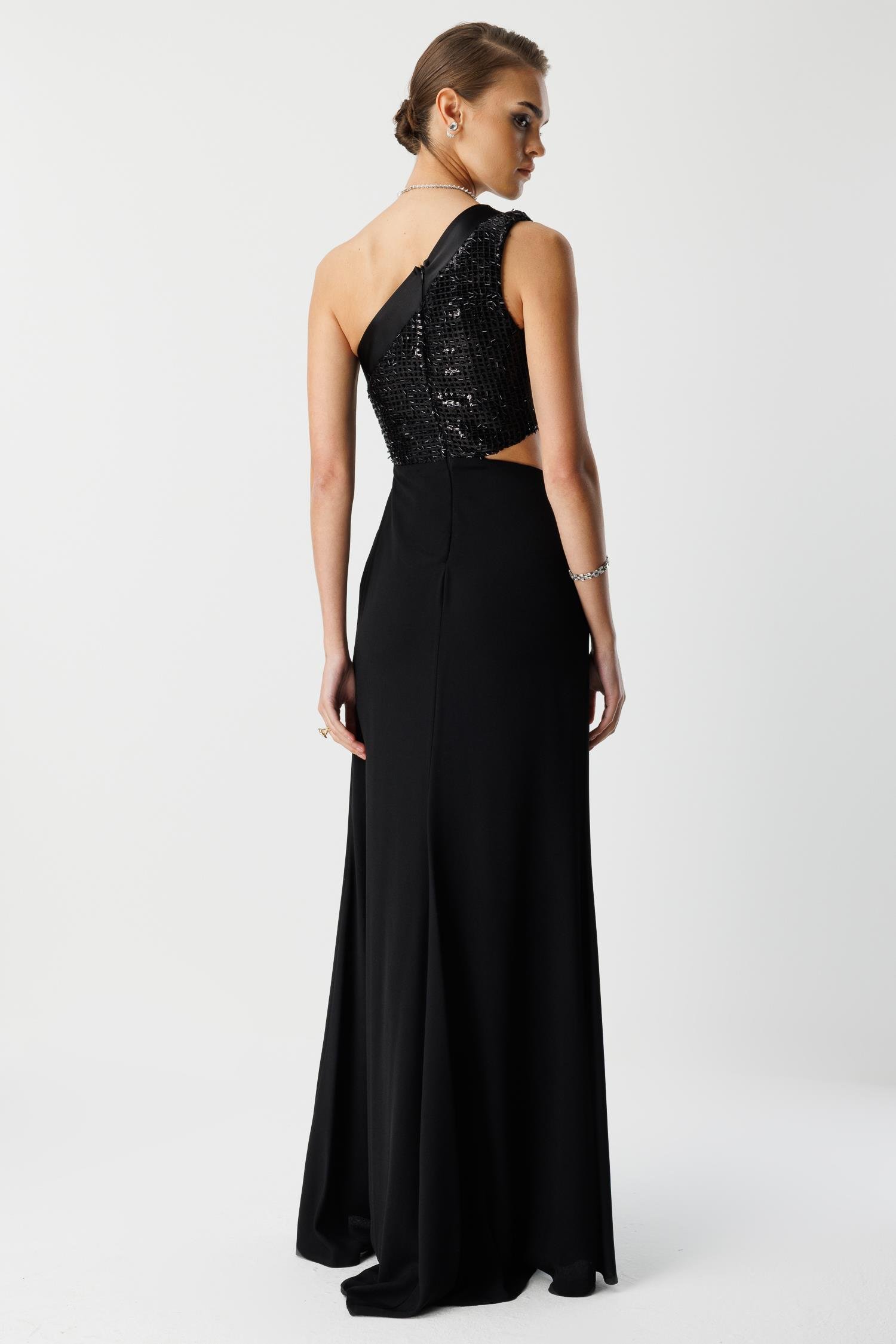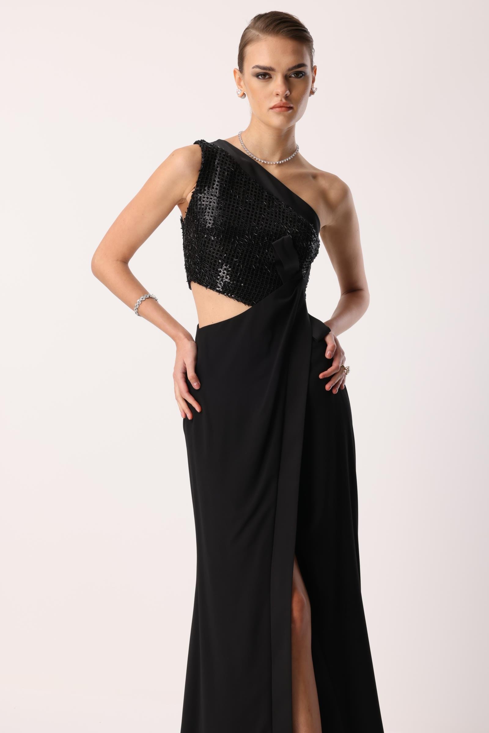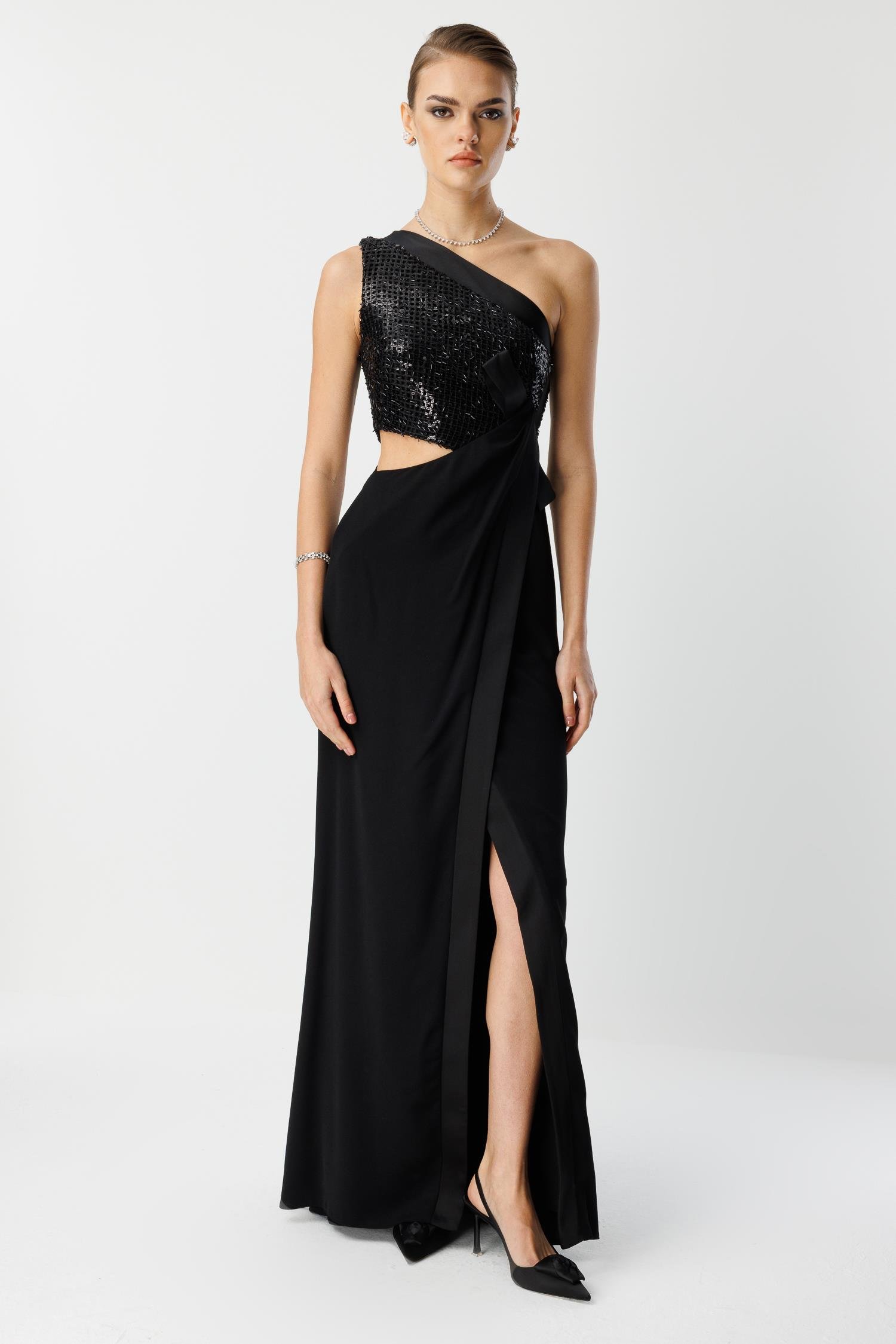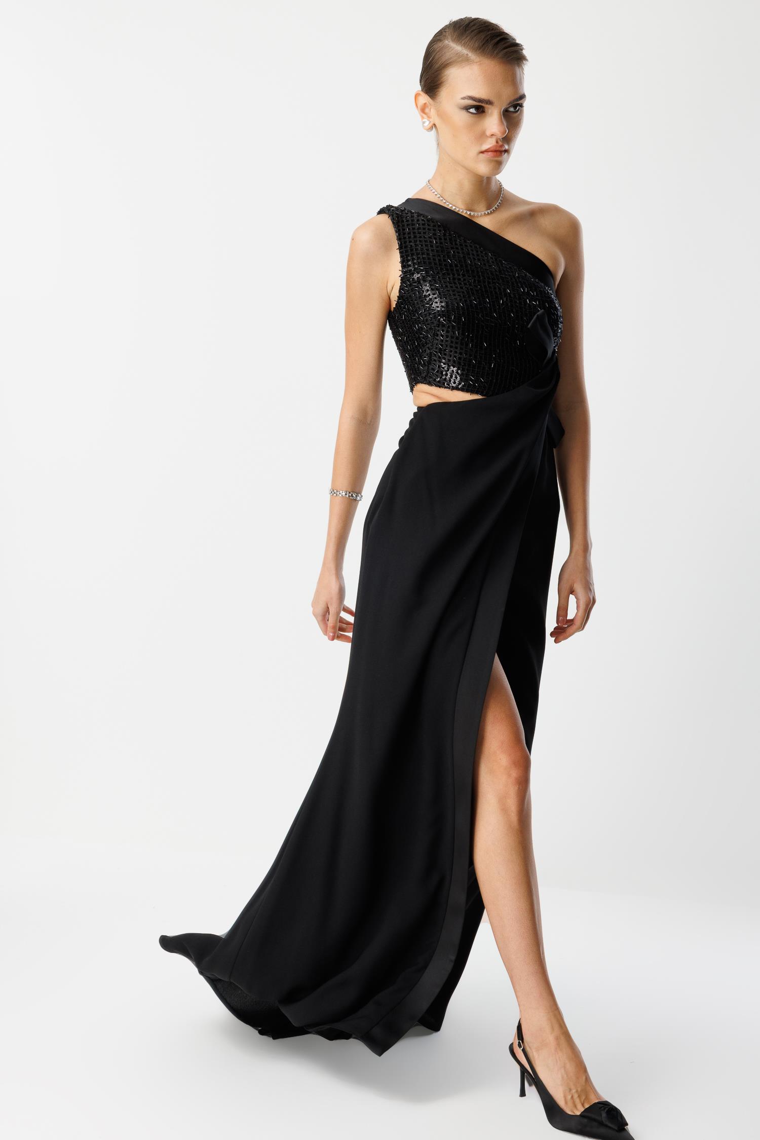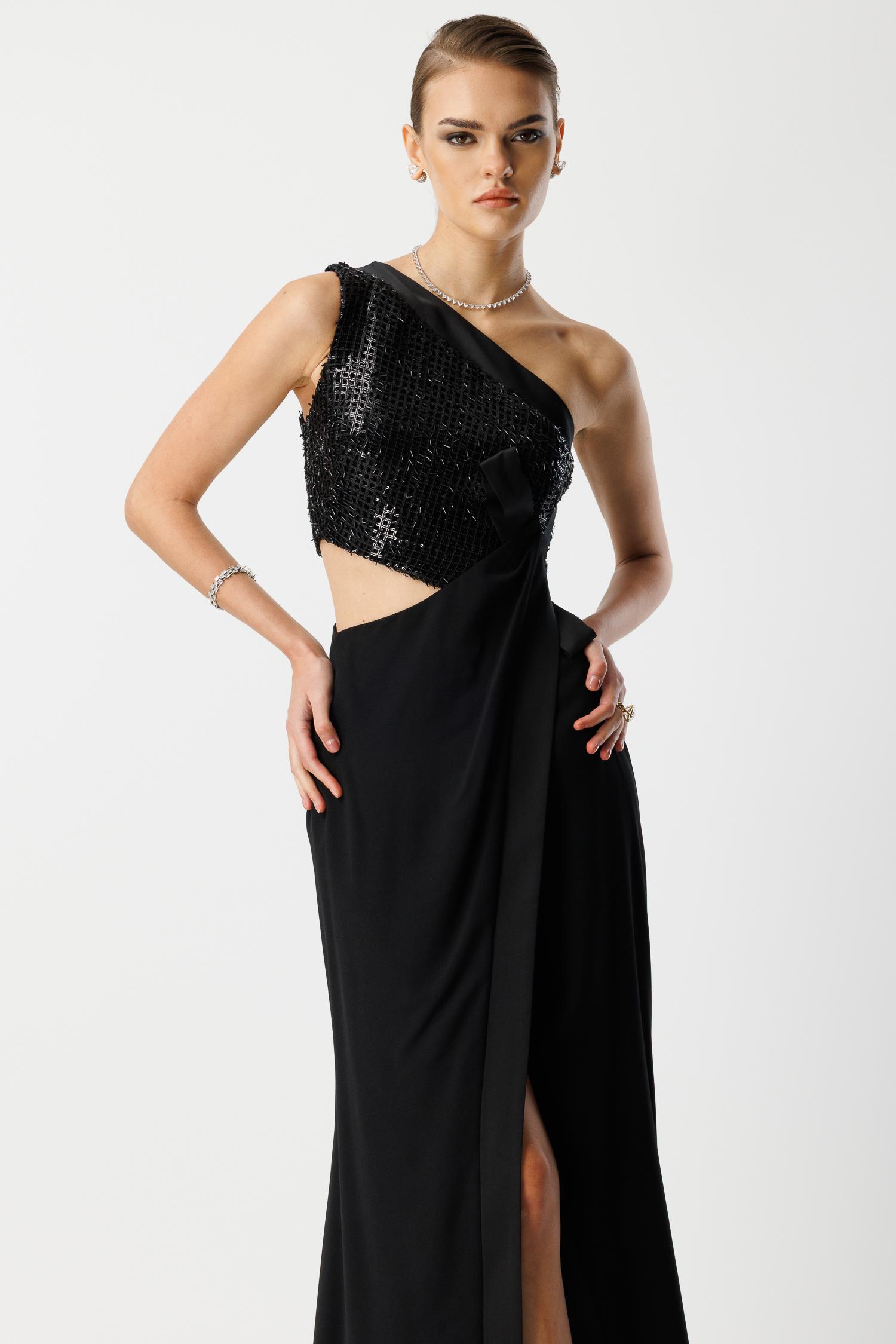 Özel galalar, lüks davetler, yılbaşı partileri ve unutulmaz geceler için tasarlanmış, iddialı ve modern bir model. Siyahın zamansız asilliği, göz alıcı payetler ve cesur kesim detaylarıyla birleşerek size benzersiz, güçlü ve sofistike bir hava katıyor.